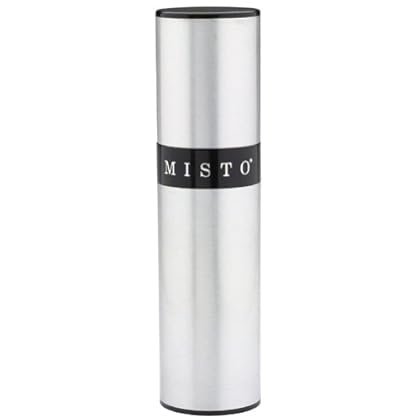 To clean, fill with hot water and a drop of mild detergent, and spray. 7-5/8-Inch high by 1-7/8-inch in diameter Satin-finish aluminum Spread olive oil on focaccia or spray muffin pans Pumps up to spray any vegetable oil Amazon.com Review For spreading olive oil evenly on bruschetta, focaccia, and grilled or roasted vegetables, and for spraying muffin and cake pans with vegetable oil, this dispenser is a nifty tool. A plastic cap underneath the sprayer's top twists off so the sprayer can be half-filled (1/3 cup) with oil. Inside the top is a plastic tube that fits over the spray nozzle. Push the top up and down to pump air pressure into the canister. Then spray for 10 seconds and pump up again. It's simple, ingenious, and practical. With its cap on, the sprayer stands just 7-5/8 inches high, so it tucks away easily on any countertop. Made of satin-finish aluminum with a black-band accent, it's sleek as well as utilitarian. --Fred Brack